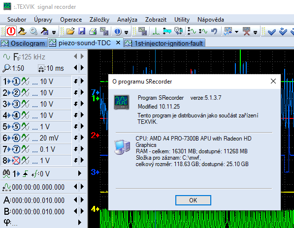 Rychlost vzorkovaní až 20 MHz při nepřetržitém datovém přenosu a ukládání záznamu na disk, což je unikátní vlastnosti přístroje. Pro počítače se slabšími parametry lze přizpůsobit parametry nahrávaní dle aktuálního měření. Pří prvním spuštění program otestuje přenosnou rychlost počítače a navrhne optimální varianty na výběr mezi rychlosti vzorkovaní a datové hloubky digitalizací signálu. | |||||||